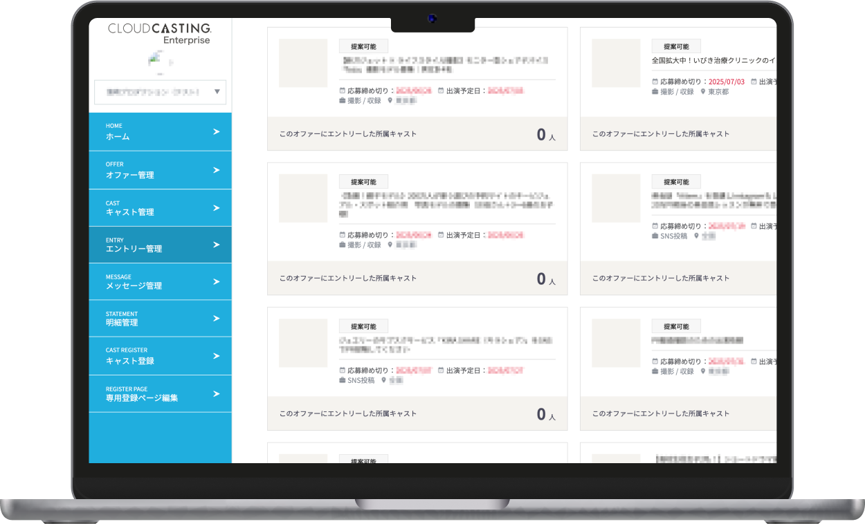 登録情報をもとに自動で案件が届きます。事務所側で確認・承認後、タレントがエントリー可能です。